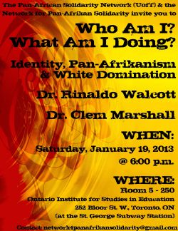 The Pan-Afrikan Solidarity Network (U of T) and Network for Pan-Afrikan Solidarity invite you to a forum that will address some provocative questions relating to identity, Pan-Afrikanism, and White domination. If you have questions or ideas about Afrikan identity and doing work to resist oppressive conditions for all people, please join us as we welcome Dr. Rinaldo Walcott and Dr. Manga Clem Marshall to lead a panel discussion: